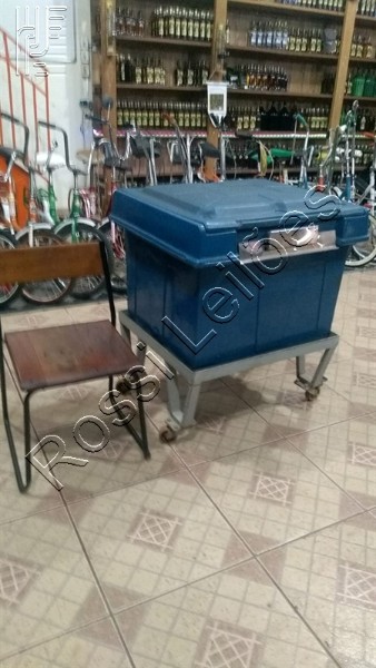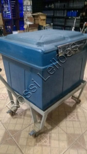 Caixa Térmica Grande. Possui carrinho e freio nos rodízios, tampa articulada removível, com trava em inox nas laterais.