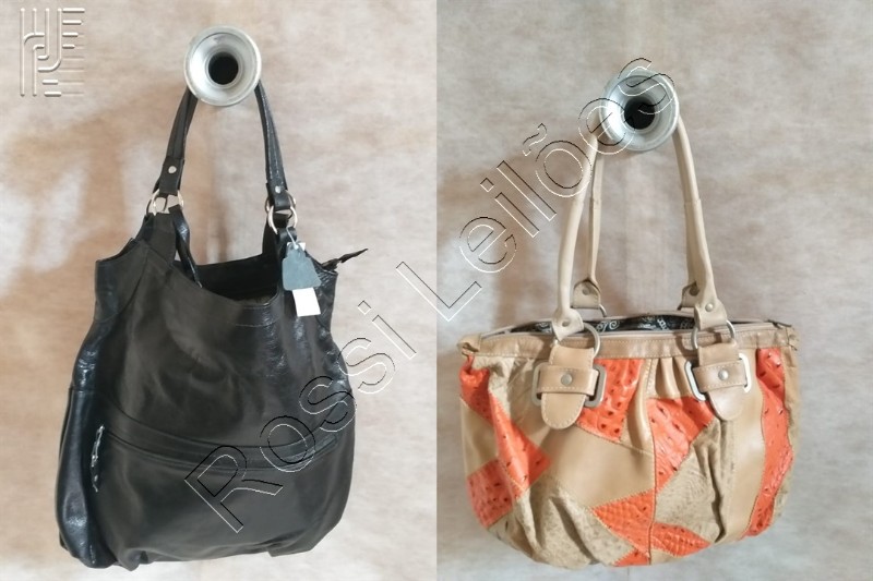 Kit com 2 Bolsas em Couro sendo: 01 Bolsa preta em couro legítimo. E 01 Bolsa em couro legítimo no estilo patchwork em tons de laranja, bege e croco bege.
