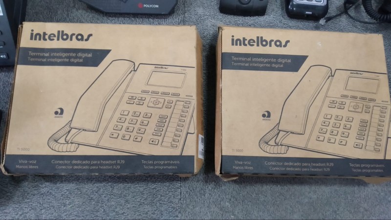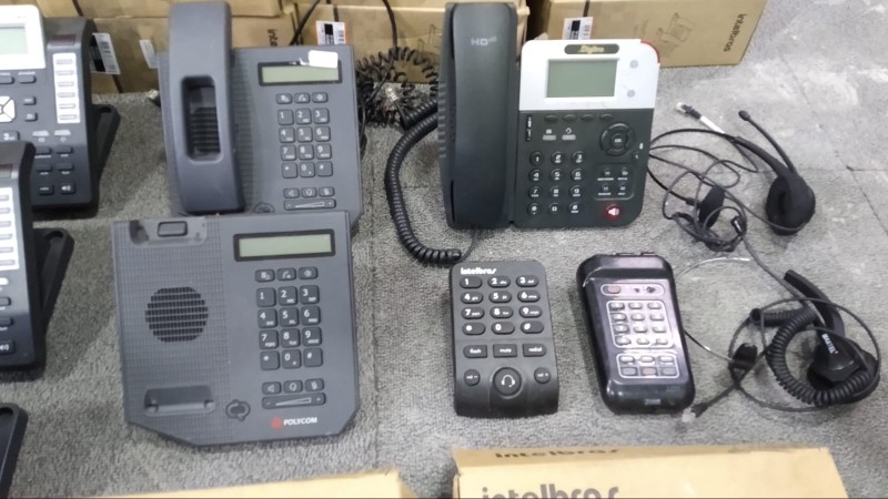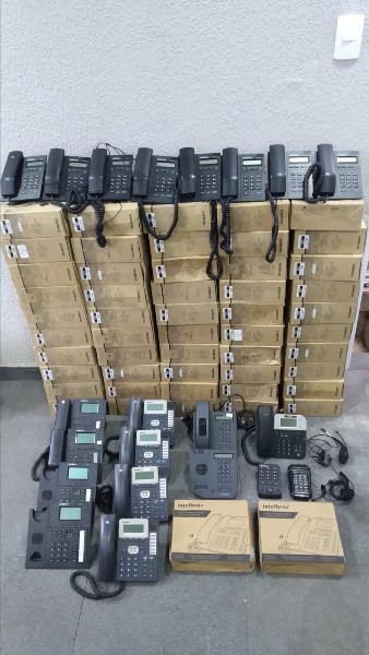 Telefones IP Intelbras TIP 125 (58 unid), TIP 200 (4 unid), Polycom CX 300 (2 unid), Digitro Digital, Telefone digital Intelbras TI 5000 (6 unid), Telefones analógicos Intelbras HSB50, Zox TZ20