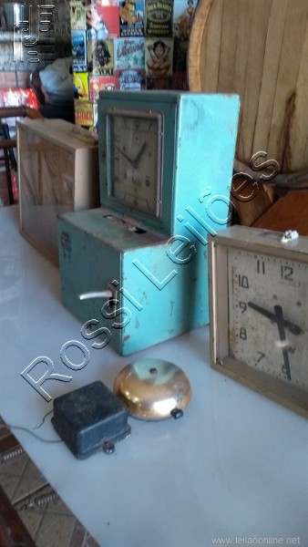 [ VÍDEO ] Lote de itens Antigos. Sendo: 01 - Relógio De Ponto, 02-Relógios quadrados grandes, 01 - Campainha de elétrica de Sino.