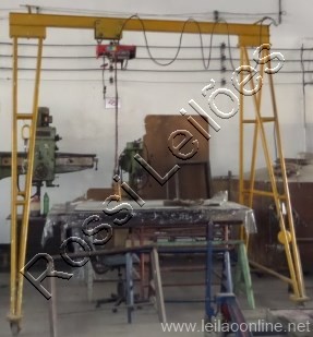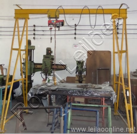 Dimensões do pórtico: profundidade: 1,60 m x largura: 3,10 m x altura: 3,50 m. Descrição talha: 400 kg; voltagem 240V; altura de içamento: 12m; velocidade de içamento: 10m/min; potencia: 1350 w.