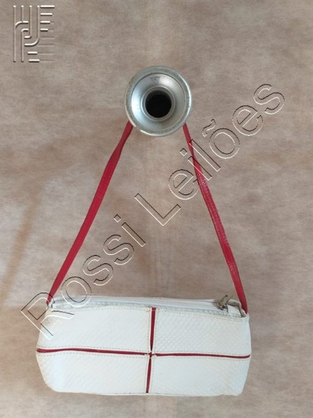 Kit com 5 Bolsas em Couro sendo: 01 Bolsa vermelha em couro legítimo; 01 Bolsa em couro legítimo na cor nude com fechamento em ziper; 01 Bolsa em couro legítimo nas cores vermelho e branca; 01 Bolsa em couro legítimo na cor branca com fechamento em ziper e detalhes em babado; e 01 Bolsa prata velho