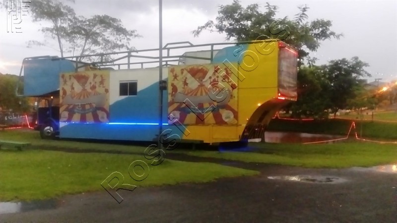 13,50 metros de comprimento, 3,00 metros de largura / 4,20 metros de altura, montada sobre chassi com travessas em viga “u” e canos de 04 (quatro) polegadas, chapas e telas de 2,5 mm toda feita com solda migui / pintura duco.