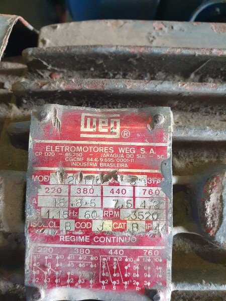NO ESTADO. Lote com: 01 motor weg 7,5 cv. 6 polos 220/380/440/760 V.; 01 motorbomba weg 5 cv. 2 polos 220/380/440/760 V.; 01 motorbomba para óleo 1/2 cv. 4 polos 220/380 V.; 01 motoredutor sem placa de identificação