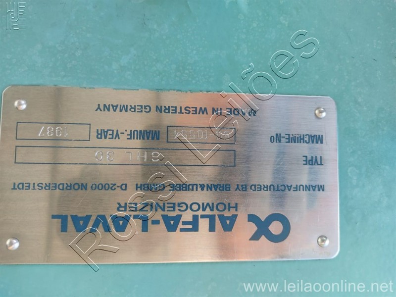 Marca: Alfa Laval Modelo: SHL-30 Número de série: 59-10554 Ano: 1987 Motor de Indução Trifasico Marca: WEG Potência: 175 CV Velocidade Nominal: 1785 RPM Tensão de corrente: 220v-420Amp / 380v-240Amp / 440v-210Amp Frequência: 60Hz Homogeneizador de alta pressão com capacidade de 20 000 l/h. Utilizado na linha de pasteurização do leite.