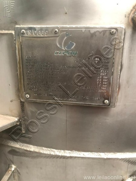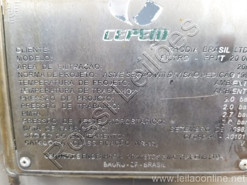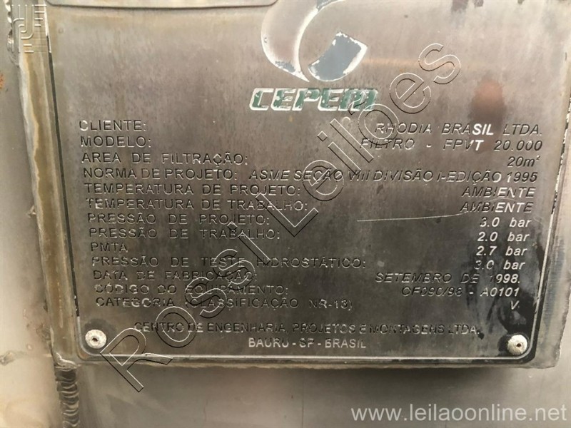Altura total aprox.: 2.900 mm Altura sem os pés aprox.: 2.200 mm Diâmetro aprox.: 1.120 mm Modelo: Filtro - FPVT 20.000 Área de filtração: 20m³ Pressão de projeto: 3.0 bar Pressão de trabalho: 2.0 bar PMTA: 2.7 bar Pressão de teste hidrostático: 3.0 bar Fabricação: Setembro/1998