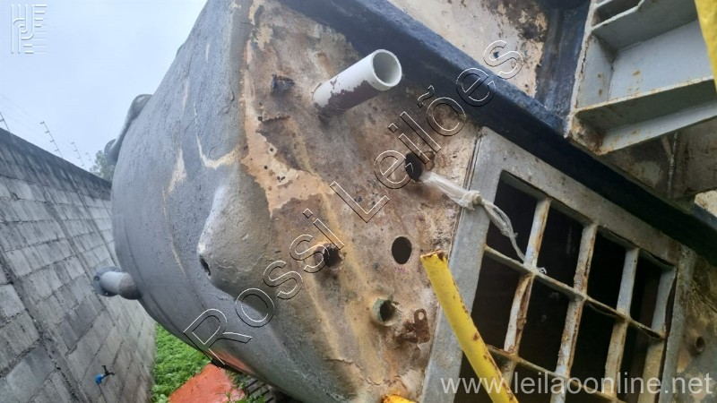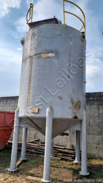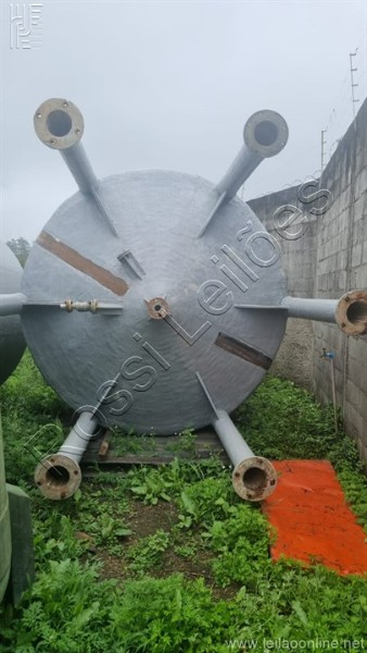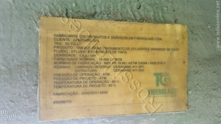 Marca: TG Fiberglass Tag: 33-TQ-27 Medidas aproximadas: Diâmetro: 2.500 mm Comprimento corpo: 3.000 mm Comprimento total com fundo conico : 4.000 mm Capacidade nominal: 15.000 litros Densidade: 1.4g/cm³ Pressão de operação: ATM Pressão de projeto: ATM Temperatura de operação: 60° C Temperatura de projeto: 60° C Tanque apoiado em 6 pés com medida aprox.: de 1.600mm cada pé. Fabricação: Janeiro/2000.