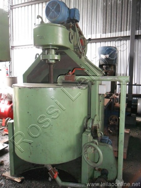 Tacho basculante em aço inox Tampa bi-partida Marca: TREU Medidas do tacho: Altura: 840mm x Diâmetro 890mm x Diâmetro do eixo 2,5" Capacidade: 500 lts Motor: WEG Potência: 20CV Redução no volante Tensão de corrente: 220/380/440 V Bomba de engrenagem com motor para retorno do produto entrada e saída de 2"