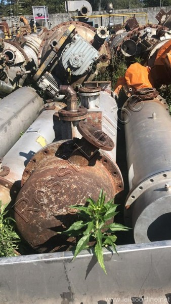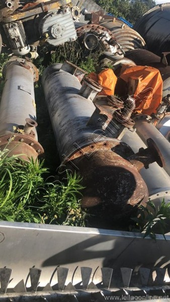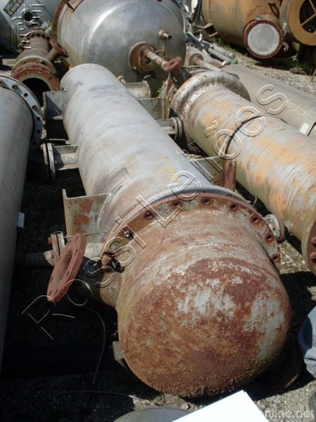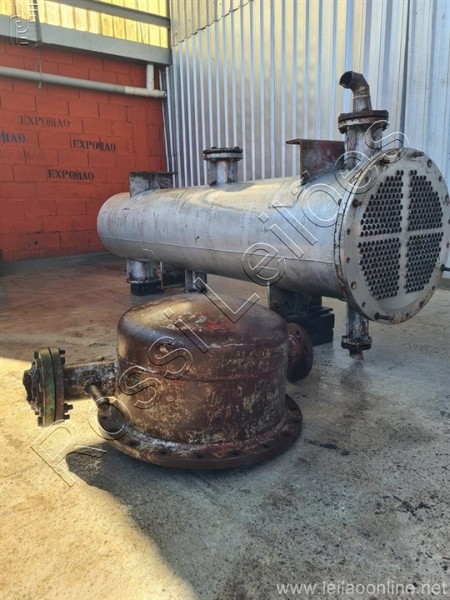 Corpo em aço carbono Tubos em aço inox Medidas aproximadas do corpo: Diametro:550mm Comprimento:3.000mm Entrada/saida:2 de 2"/ 2 de 3"/ e 1 de 6,5" Medidas aproximadas do tubos: Comprimento:2650mm Diametro:20mm Quantidade:368 tubos Área de troca aprox.: 61,24 m² Volume de água no corpo aprox.: 0,513724m³ Aço inox 304