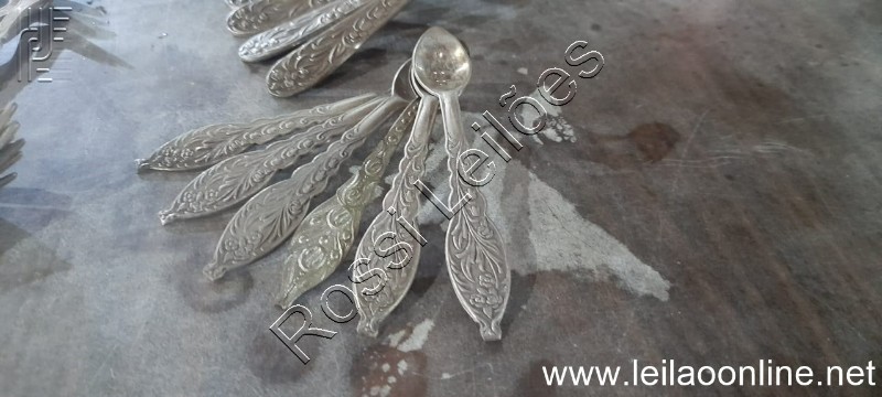 Jogo talheres antigos / Metal em detalhes. Sendo: 6 colheres de chá, 6 colheres de café, 6 garfos de sobremesa e 6 garfos pequenos