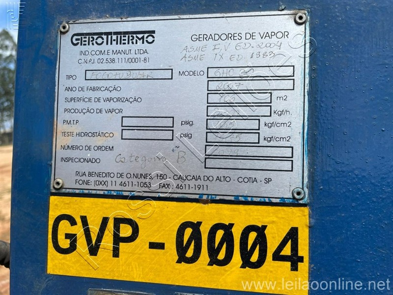TIPO : Fogo Tubular / Modelo : GHO 30 Ano : 2007 / Pressão trab. : 10,50 kgf/cm 2 / Pressão teste: 15,75 kgf/cm 2 . Pode necessitar de reparos.