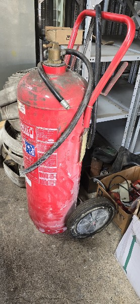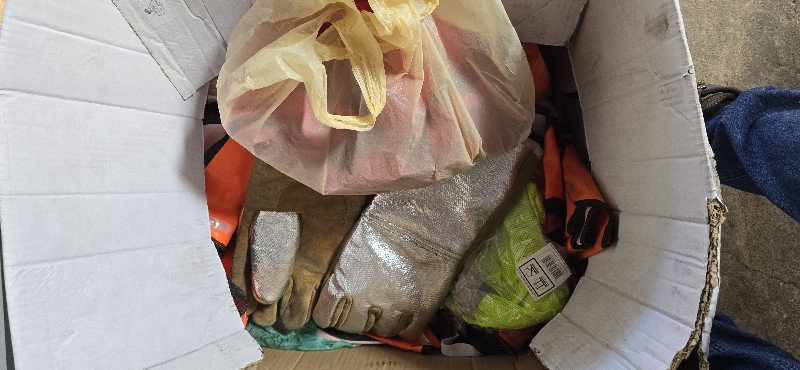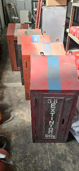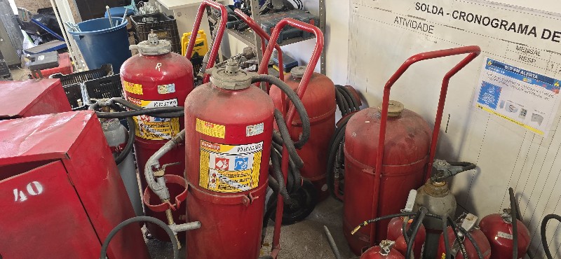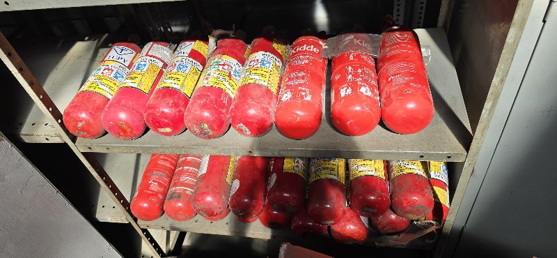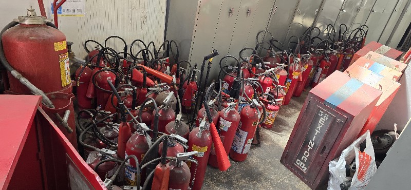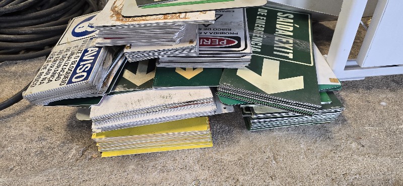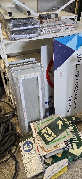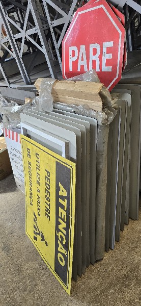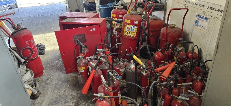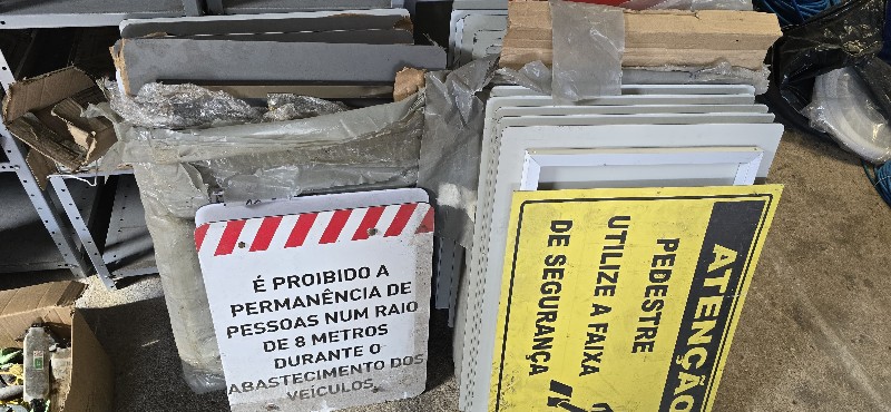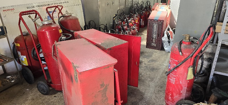 Lote com: Aproximadamente 120 extintores ,caixas ,roupas, acessórios e 150 placas
