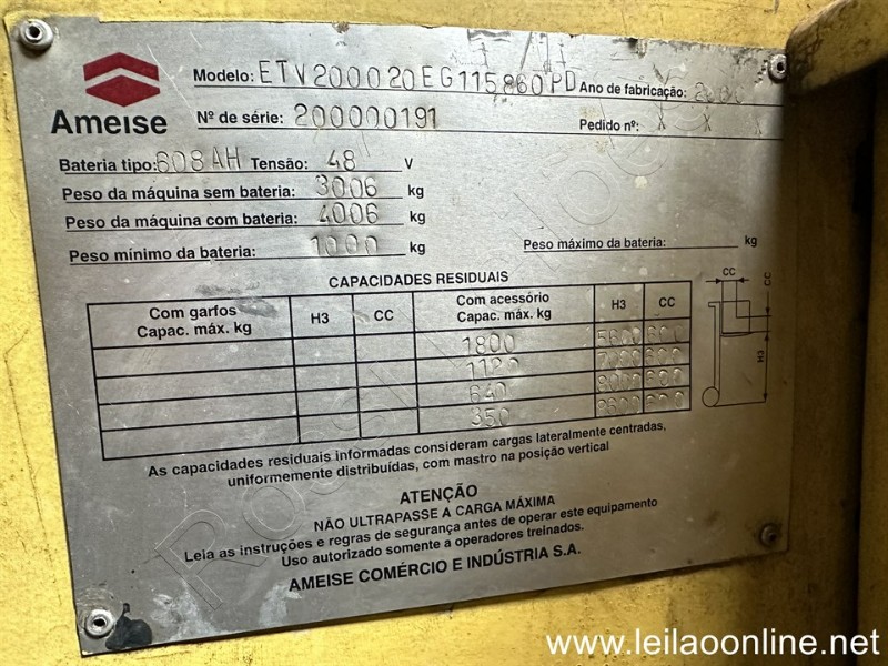 EMPILHADEIRA ELÉTRICA AMEISE; MODELO: ETV20; CAPACIDADE: 2T; TORRE: 6,0M TRIPLEX; SEM BATERIA E SEM CARREGADOR NO ESTADO