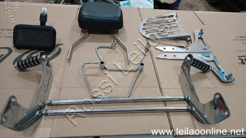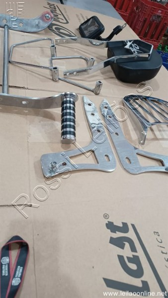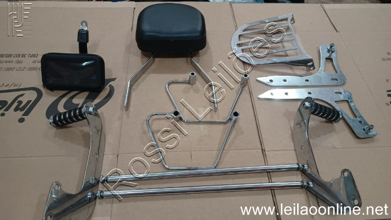 BAGAGEIRO TRASEIRO, PROLONGADOR DE PEDALEIRAS MARCA CUSTON DALAVA'S, ENCOSTO DE GARUPA MARCA V2 CUSTOM, AFASTADOR DE ALFORGES E SUPORTE DE CELULAR OU GPS, CONFORME FOTOS