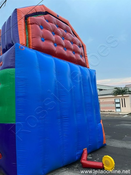 Acompanha 01 saco para transporte, 01 lona para escorregar e 01 motor soprador para inflar.