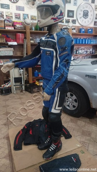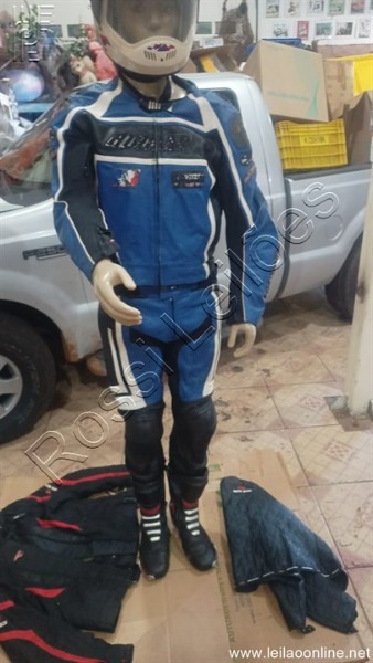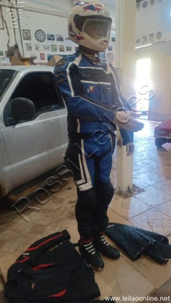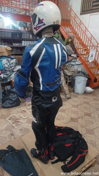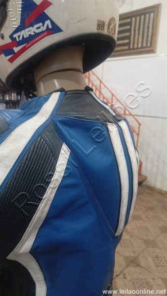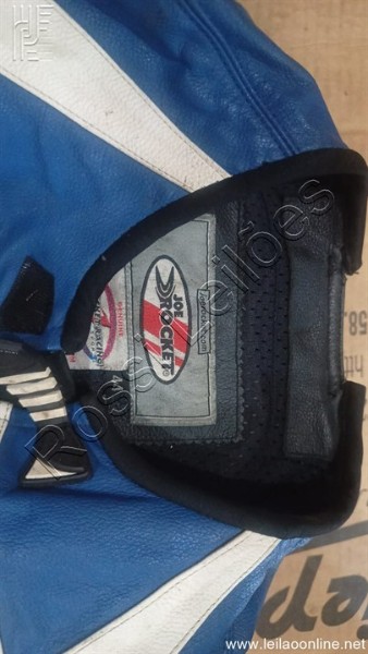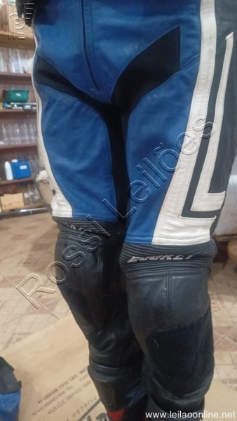 01- CONJUNTO DE CALÇA E JAQUETA EM COURO, COR AZUL E PRETO JOE ROCKET N°44;
