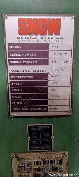 Rosqueadeira para porcas,flanges e outras peças máquina de rosquear porcas (Nut Tapping Machine) da Snow Manufacturing Co., modelo NT-3. Função: Esta máquina é utilizada para criar roscas internas em porcas e outras peças com furos, como flanges. Fabricante: Snow Manufacturing Co., localizada em Bellwood, Illinois, EUA. Características do motor: Motor de 3/4 HP, 1150 RPM, 220 Volts, 60 Hz, trifásico. Automação: Máquinas de rosquear porcas automáticas podem alimentar, posicionar, prender, rosquear e descarregar as porcas, permitindo que um único operador gerencie múltiplas máquinas. Aplicações: Essencial na indústria de fixadores, automotiva, aeroespacial, construção e manufatura, onde porcas roscadas precisam atender a tolerâncias dimensionais rigorosas.