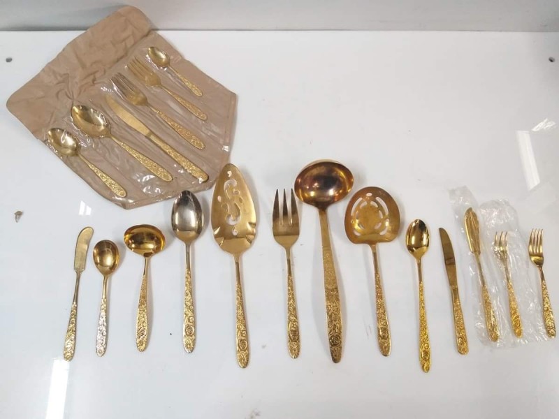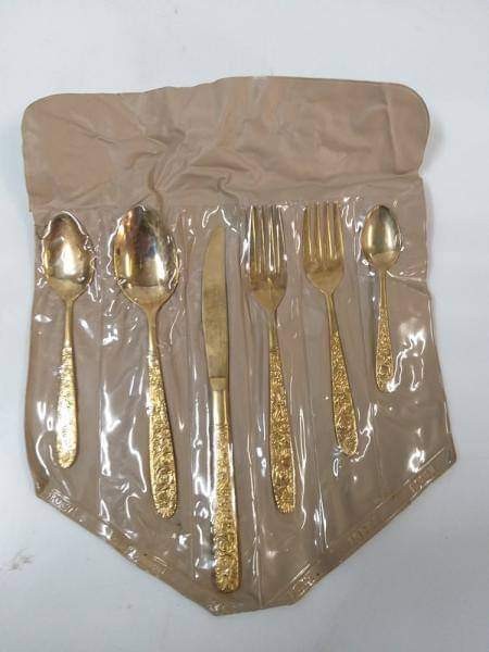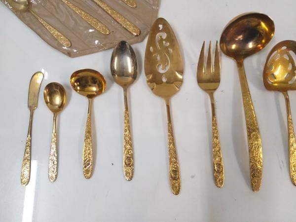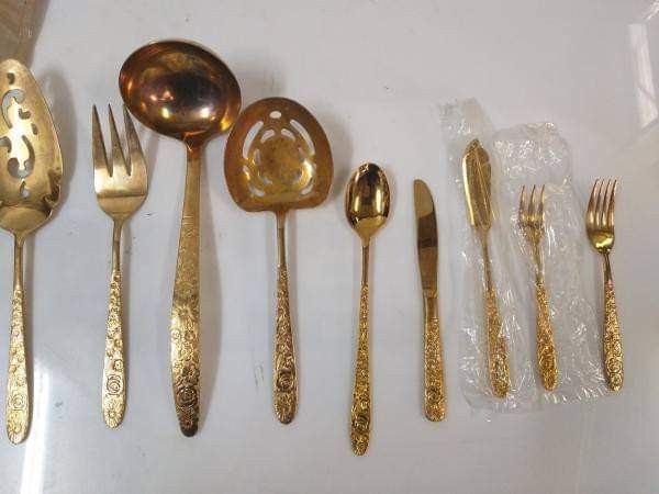 Jogo de talheres importados japao banhados a ouro, são 139 peças sendo 10 jogos de talheres com 12 unidades cada, 01 jogo com 11 facas de sobremesa e 8 de serviços. Produto conservado, antigo, apresenta pouco desgaste. acompanha 12 embalagens de 6 unidades. Restante todos embalados individualmente.