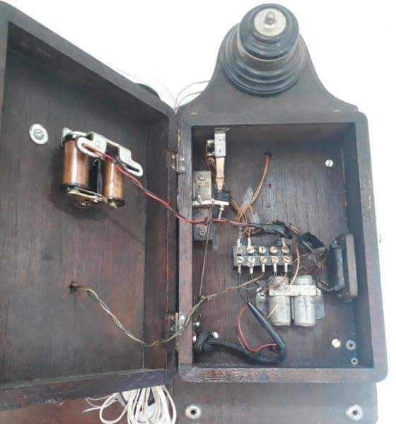 Antigo telefone de madeira e metal, 78cm de altura