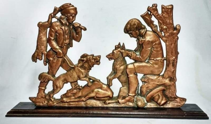 Estátua em bronze banhado a cobre - apoio de madeira - (23.5 x 43 x 8 cm)
