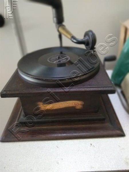 Gramofone. Réplica com aproximadamente 29 discos antigos de 78 rotações