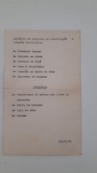 Exclusivo peça unica Cardápio da seleção brasileira de 1970 autografado num evento qu foi realizado no Rio de Janeiro nesta data do cardápio.13 cm de largura e altura 23cm aviado por historiador