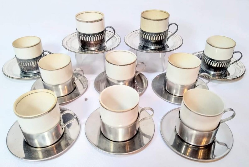 Lote com: 10 antigas xícaras para café, em metal, com recipientes em porcelana filetada a prata. dois conjunto, um com 4 e outro com 6 peças