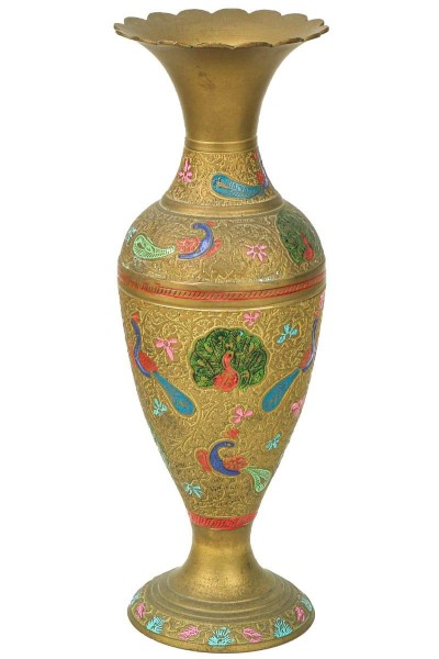 Floreira, em bronze, decorada com pavões coloridos. Dimensões: 26 cm X 10 cm