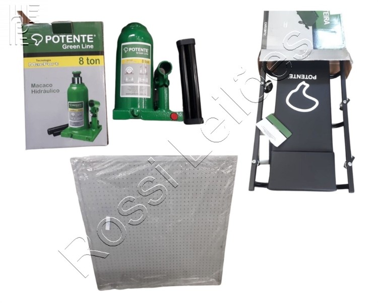 1 carro esteira para mecânico 1 macaco hidráulico de 8 toneladas quadro de ferramentas com 10 ganchos. Produto sem uso.