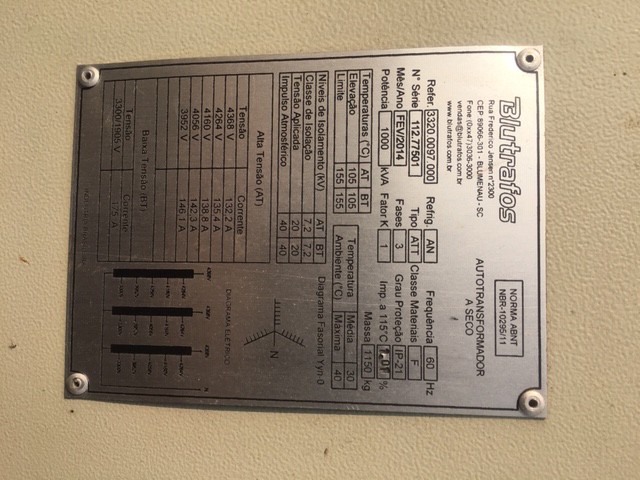 Auto transformador a seco, capacidade 1000 kVA - Marca: Blutrafos, tipo ATT, ano 2014, 1150kg, entrada 4.368v, 1400mm x 1100mm x 2200mm - Funcionando 100%