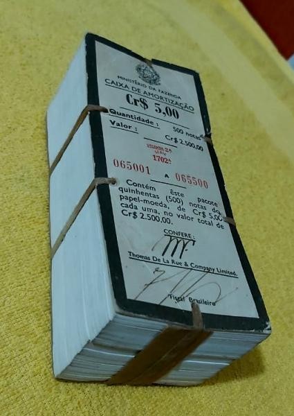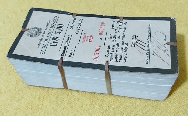 500 notas de 5 cruzeiros, Barão do Rio Branco, série 1702. Numeração de 65001 a 65500 - cada nota no mercado custa 25 reais - pacote avaliado em R$10.500,00