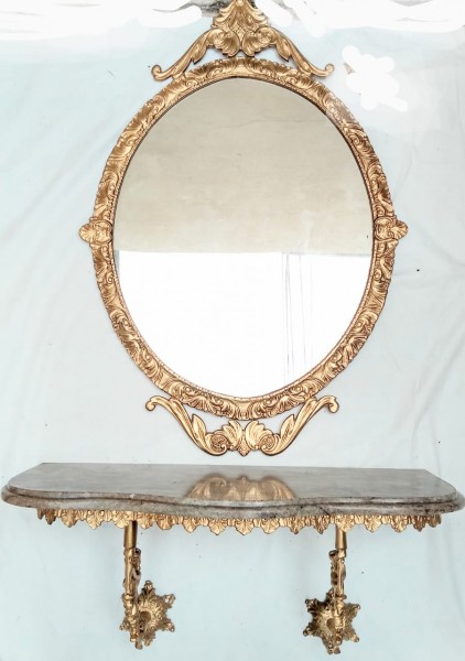 Raro console LUIS XV com espelho francês, em bronze, banho de ouro, com tampo de mármore. 25/60/28cm - espelho mede 73/52 cm