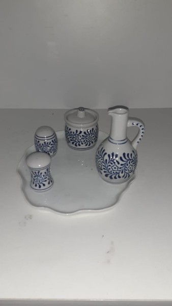 Antigo conjunto galheteiro, ANOS 40, em cerâmica vitrificada 1 bandeja, 1 molheira, 1 galeta, 1 saleiro, 1 pimenteiro. Total 4 peças. Peças marcadas ao fundo. Med.: 6 a 26x20 cm