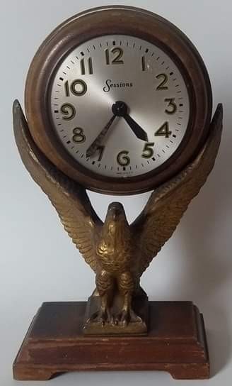RELÓGIO AMERICANO, SESSIONS ÁGUIA EM BRONZE, BASE DE MADEIRA. ALTURA DE 26,5 CM