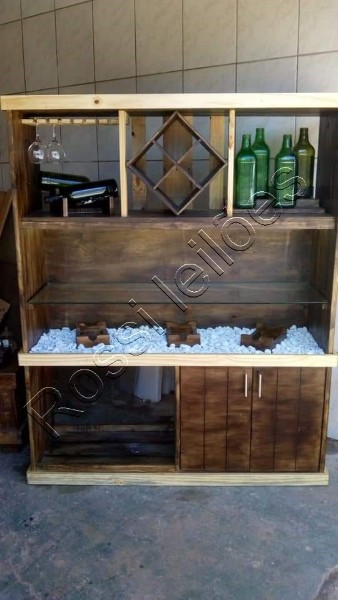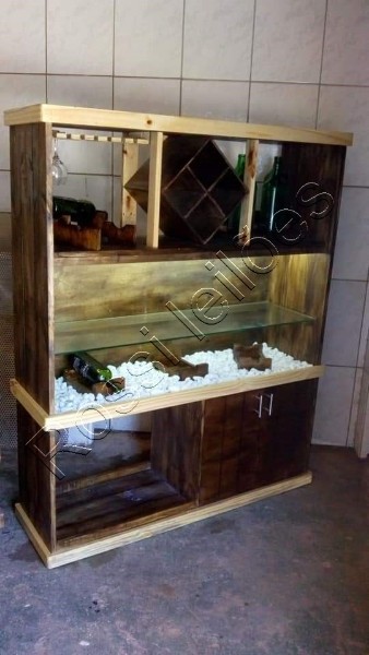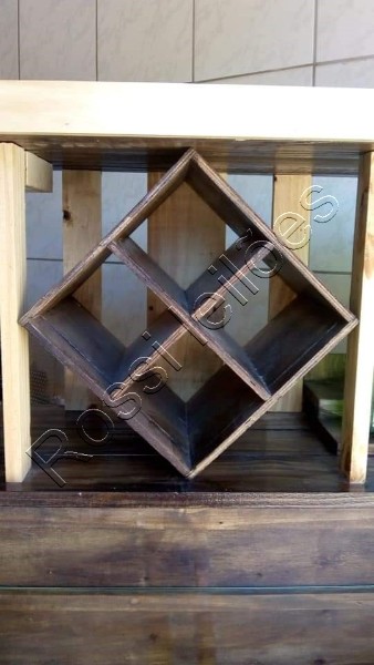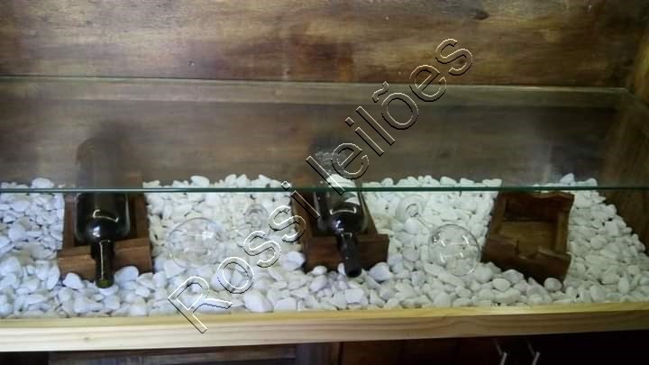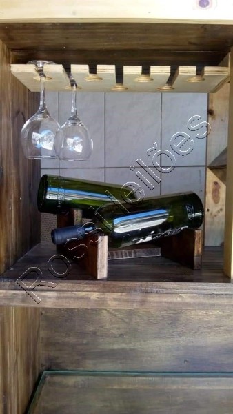 - Pedras brancas em uma prateleira com apoios para vinhos.