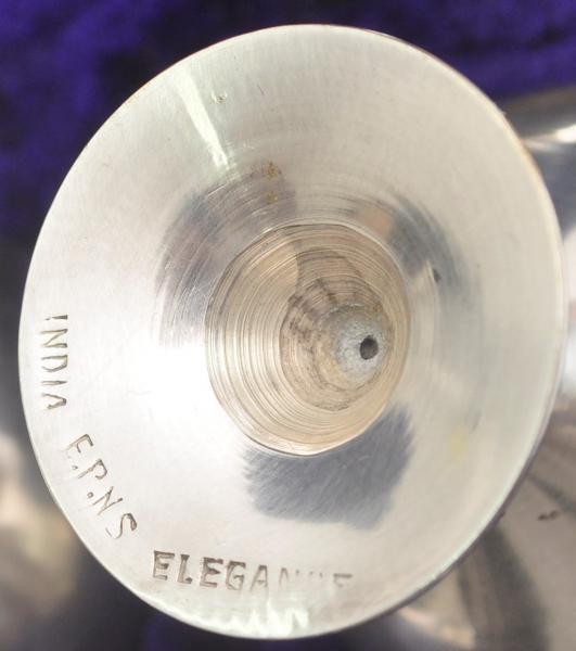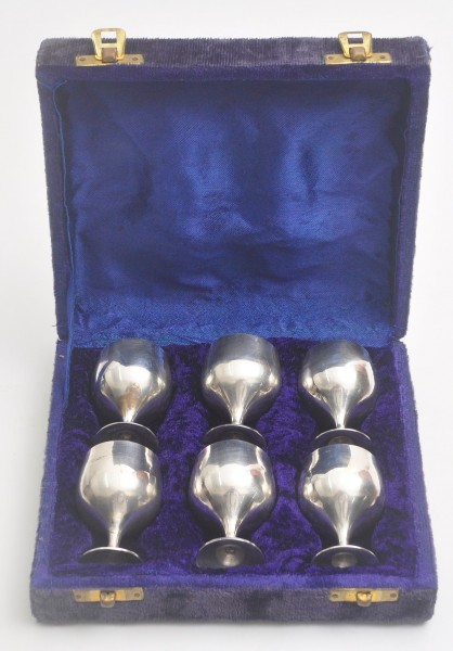 Conjunto antigo com 6 taças em metal com banho de prata de procedência indiana, em perfeito estado medida : 6 x 3 ,5 de cálice , acompanha caixa expositora forrada em veludo azul
