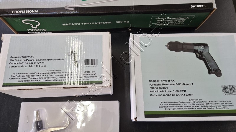 ( 4 itens) 1 macaco Sanfona 1 furadeira reversível pneumática 1 pistola pintura 1 bico sopro. Itens sem uso.